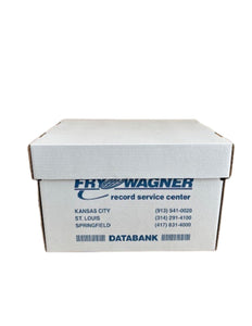 Two Piece Record Storage Box with removable lid; double wall construction with hand holds on the two sides. Size: 15x12x10”